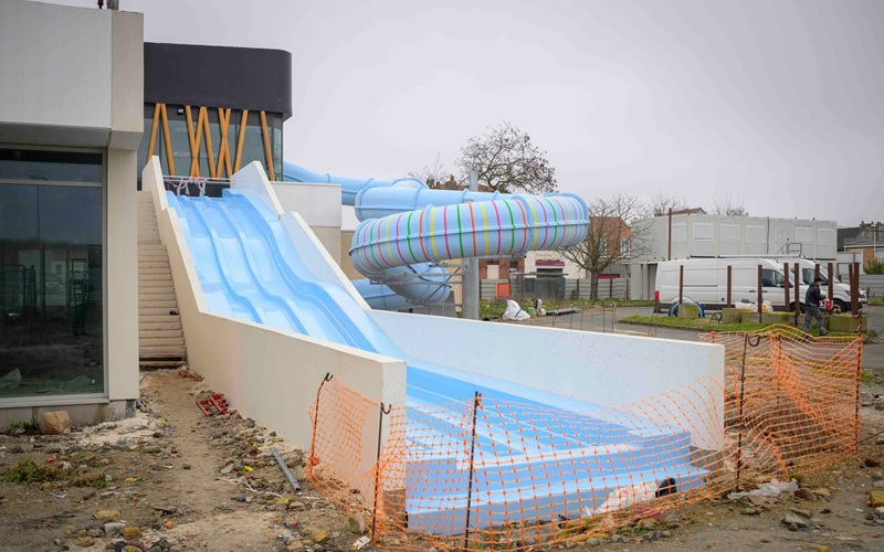 - Le grand toboggan est installé, il passe à l’extérieur et reviendra dans un bassin intérieur, donnant ainsi une sensation de plongeon. Il vient rejoindre les toboggans (pentagliss) extérieurs, renforçant l’offre de jeux aquatiques qui feront le plaisir, des petits et des grands.